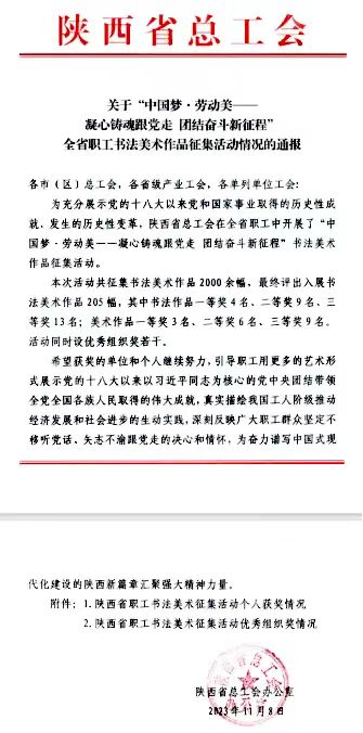 jdb电子原春鸣老师在陕西省 “中国梦·劳动美”全省职工书画大赛中获二等奖。