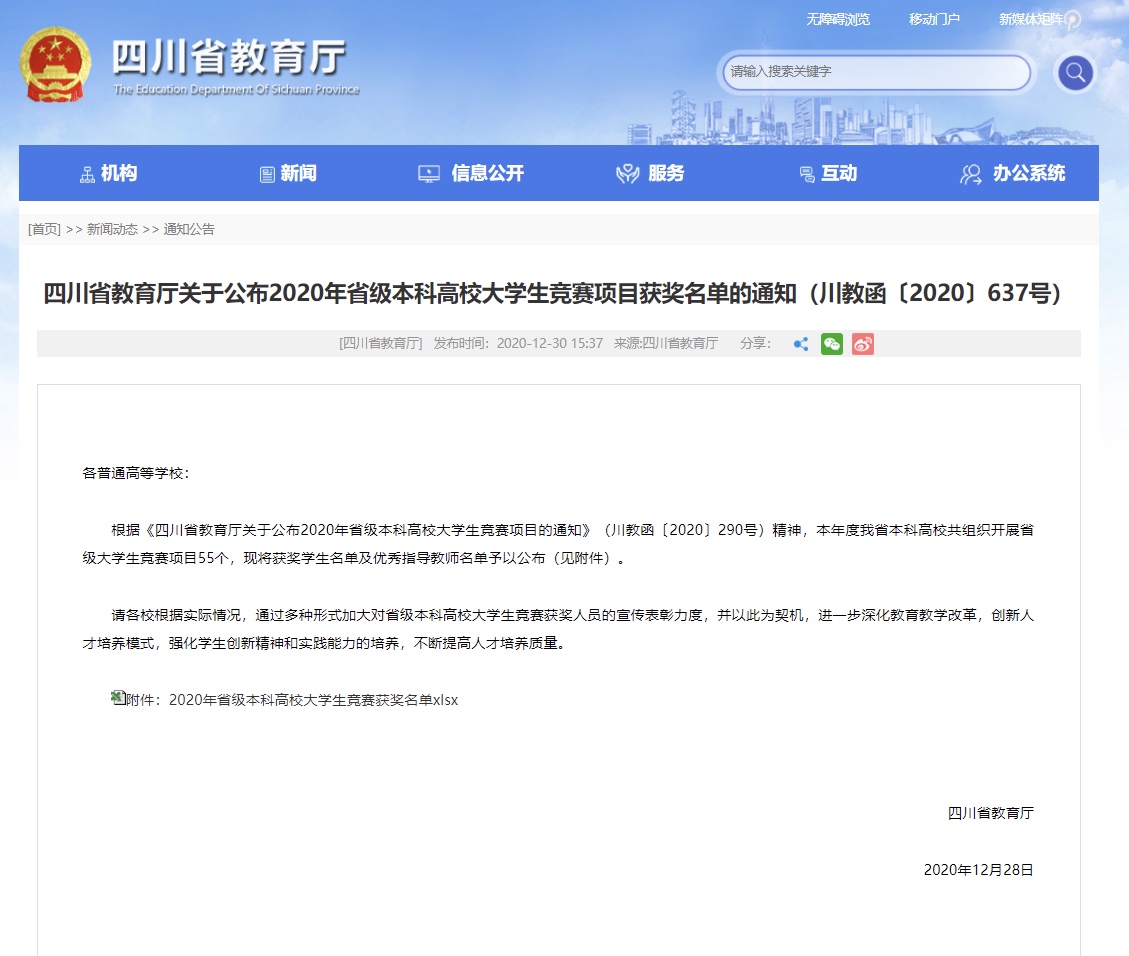 12月31日,2020年四川省大学生原创动漫大赛评审结果在四川省教育厅和四川省本科高校竞赛平台官网上陆续公布,jdb电子学生取得佳绩,获得一等奖1项、二等奖2项、三等奖9项,南京、刘婉毅获得“优秀指导老师”。