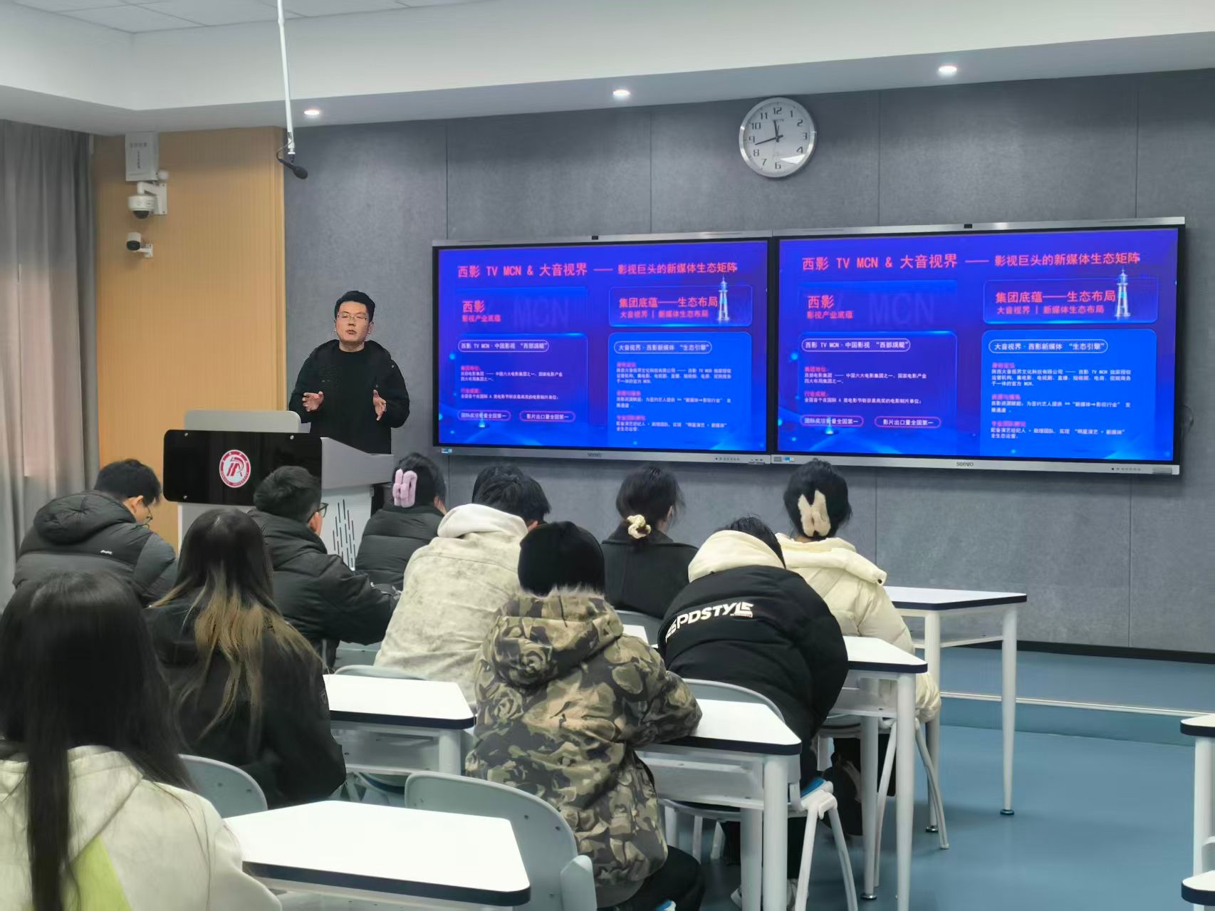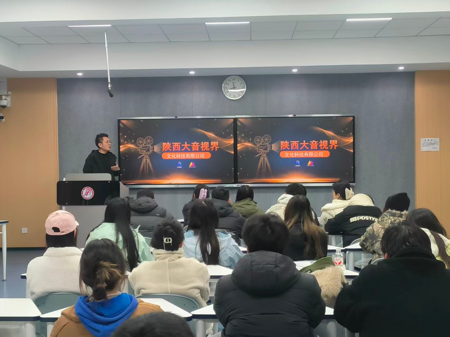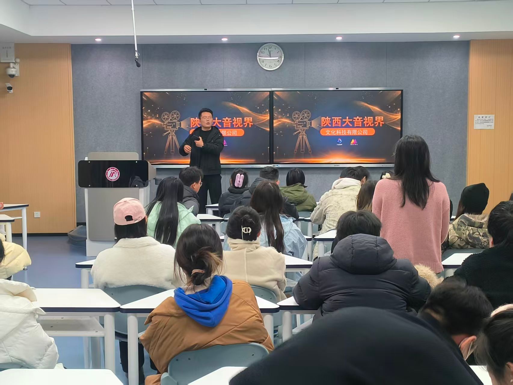 宣讲会伊始,陕西大音视界文化科技有限公司宣讲负责人通过PPT展示,全面介绍了公司的企业文化、公司定位与业务闭环、数字媒体艺术等领域的业务布局、发展成果与行业优势,深入解读了企业文化内核与人才培养体系。针对毕业生关心的岗位需求,负责人详细介绍了各岗位在专业技能、创新思维等方面的任职要求,强调公司重视青年人才成长,将为入职者提供完善的薪酬福利、清晰的职业晋升路径及项目实践机会。