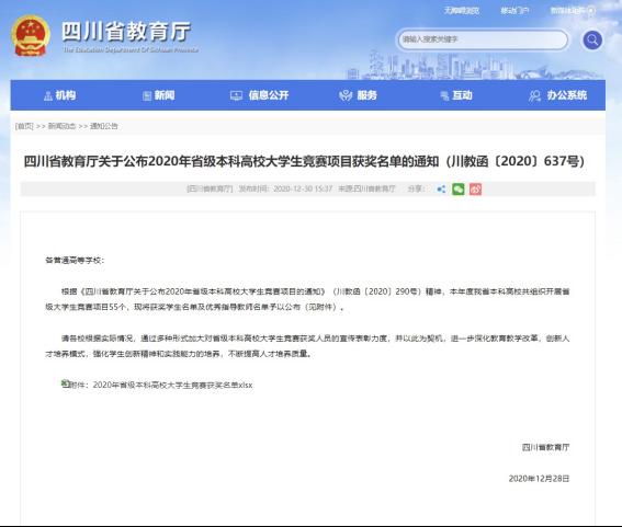 12月31日,2020年四川省大学生原创动漫大赛评审结果在四川省教育厅和四川省本科高校竞赛平台官网上陆续公布,jdb电子学生取得佳绩,获得一等奖1项、二等奖2项、三等奖9项,南京、刘婉毅获得“优秀指导老师”。