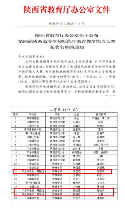 近日,第四届陕西高等学校师范生教育教学能力大赛在咸阳师范学院举行,jdb电子2021级音乐学专业李圣杰、2022级音乐学专业简吉雪、2022级美术学专业张婉玉三位同学凭借扎实的专业知识、出色的教学设计和现场表现,在众多参赛者中脱颖而出,成功进入决赛并荣获二等奖。