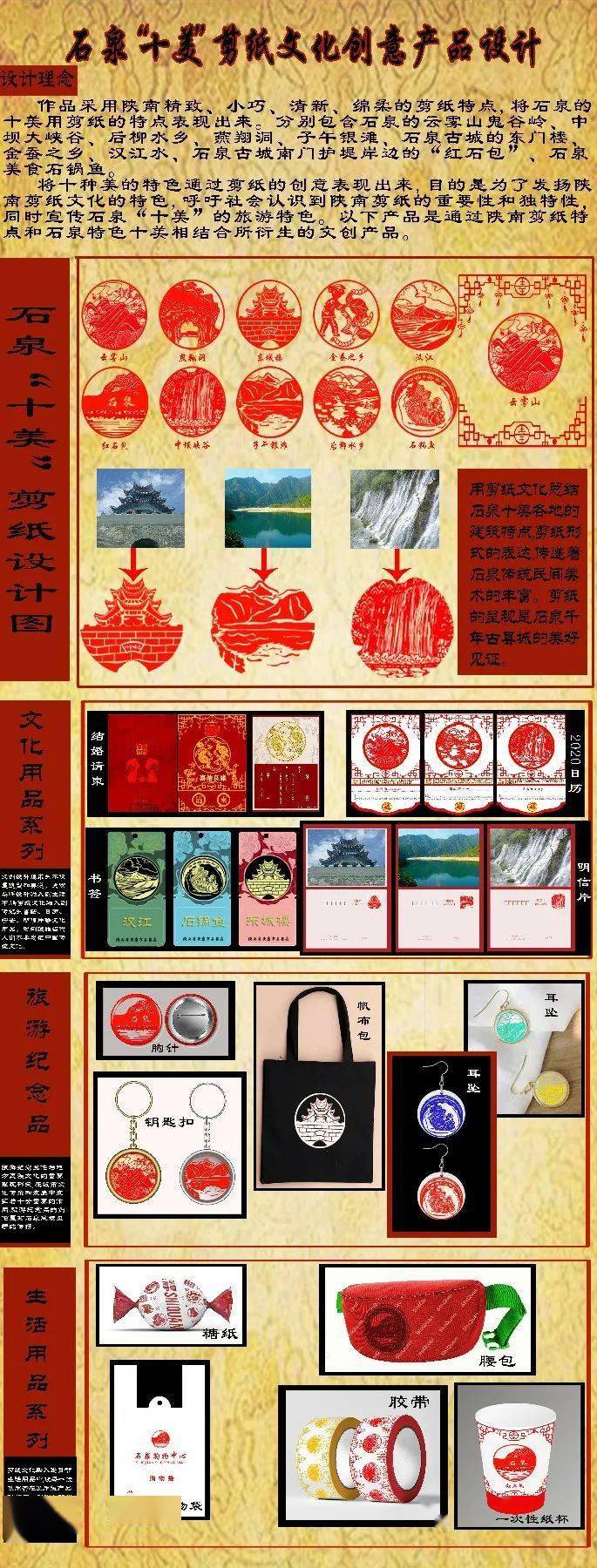 设计说明:作品通过采用精致、小巧、清新、绵柔的陕南剪纸,将“石泉十美”的特点表现出来。设计中涵盖了石泉的云雾山鬼谷岭、中坝大峡谷、后柳水乡、燕翔洞、子午银滩、石泉古城东门楼、金蚕之乡、汉江水、石泉古城南门红石包、石泉食美石锅鱼等旅游文化要素。将“十美”通过创意剪纸表现出来,既有利于弘扬陕南剪纸文化,又有利于宣传石泉十美的旅游特色。