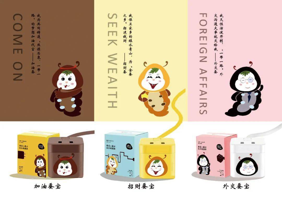 设计说明:石泉县位于陕西省安康市西部,北依秦岭、南枕巴山,自然、民俗文化独具特色。且石泉是西部第一蚕桑产业大县,国家南水北调重要的水源涵养地和西部重要的电力能源基地,被誉为“丝路之源·金蚕之乡”。我的设计思路便由这两点结合转化而来。安康石泉,是属于丝路起源之地,鎏金铜蚕是“一带一路”新IP。三款不同的蚕宝卡通身份形象代表当地政治、经济、文化三者齐头并进、相互兼容发展。卡通蚕宝充电转换插头,设计创意、设计风格及IP个性化形象可以吸引当代旅游消费人群的喜爱。且这种充电插头有各种插孔、体积空间较小,减轻负重方便携带,解决旅游途中手机、平板电脑、充电宝等多种设备电量不足、插孔不够用的困扰,同时带回家也可长期使用。产品外观直接凸显出“金蚕之乡”主题,同时寓意着安康石泉县作为丝路之源,为“一带一路·金蚕之乡”的战略梦想充电助力。
