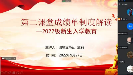 为使2022级新生初步了解学院人才培养计划,尽快适应大学新生活。9月27日下午,jdb电子中国官方网站在线上开展了“第二课堂成绩单制度解读”专题讲座。本次讲座由团总支书记孟莉主讲,2022级全体新生参加活动。