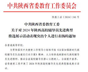 近日,中共陕西省委教育工委对2024年陕西高校辅导员先进典型推选展示活动中表现突出个人进行表扬通报,jdb电子辅导员鲁澧荣获“2024年陕西高校表现良好辅导员”称号。