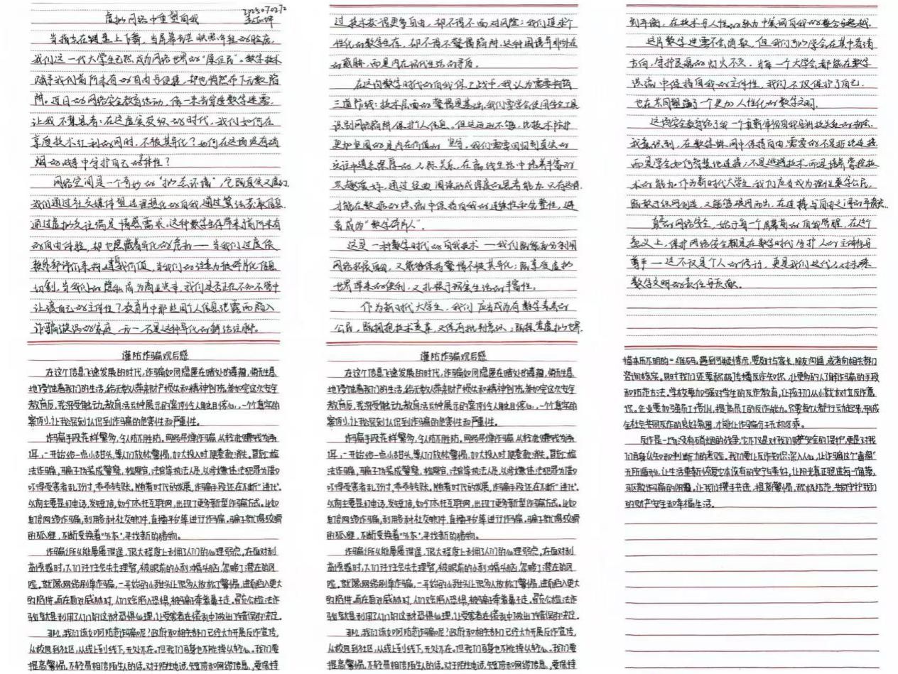 系列活动尾声,学院鼓励新生结合线上课堂所学与班会讲解内容,撰写个人心得体会。同学们在文中分享对电诈危害的新认知、防骗技巧的新掌握,字里行间满是参与活动的真实感悟,也标志着此次反诈教育真正入脑入心。