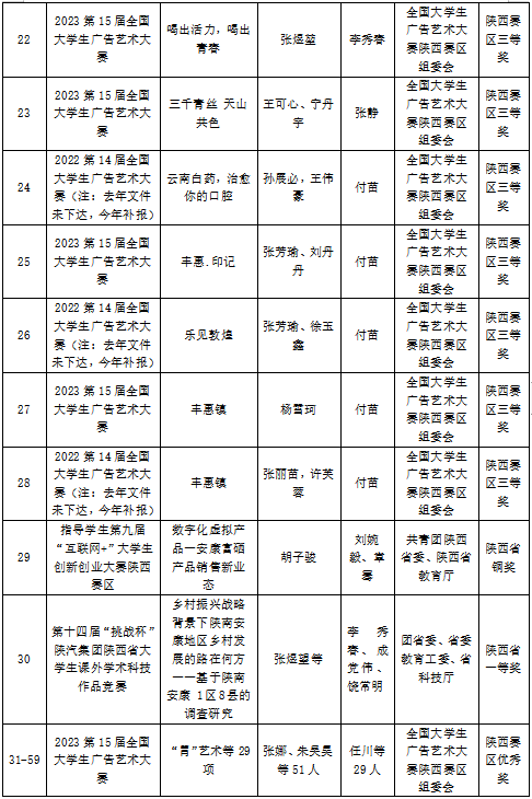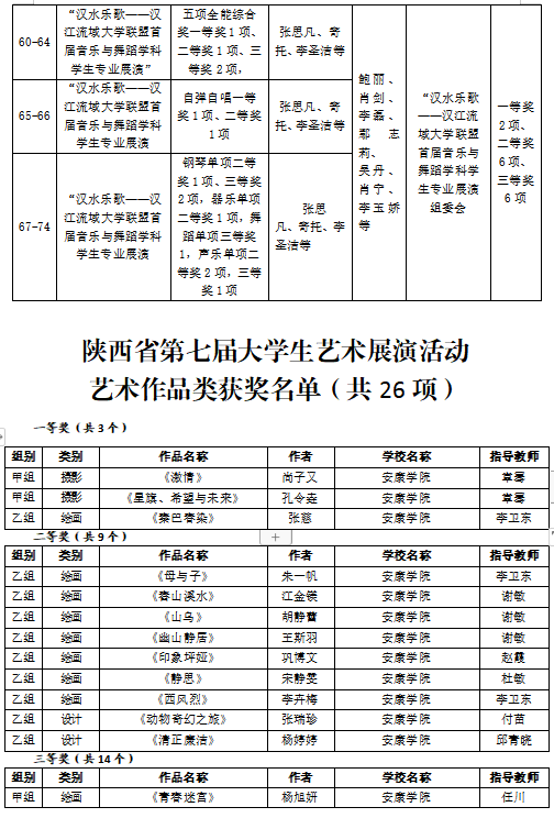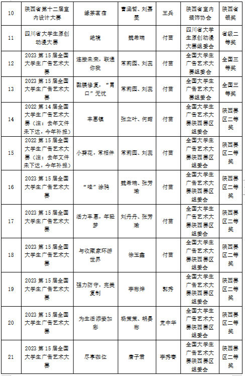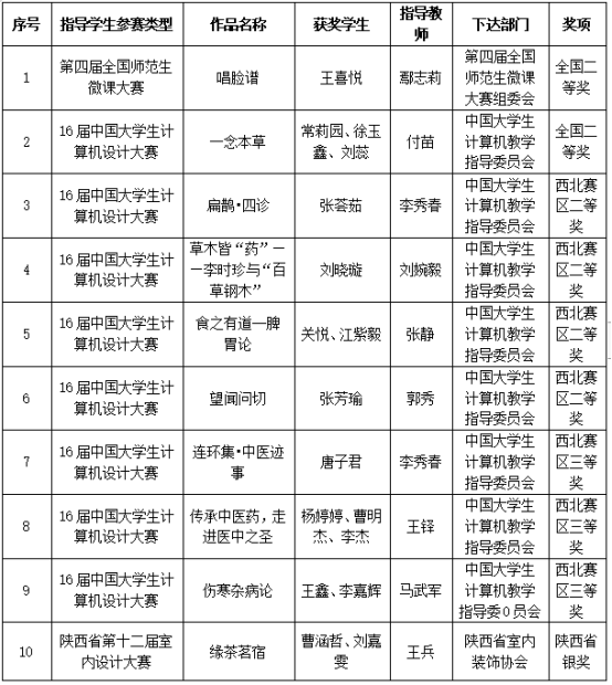 2023年,jdb电子中国官方网站学子在16届中国大学生计算机设计大赛、第15届全国大学生广告艺术大赛、第十四届“挑战杯”陕汽集团陕西省大学生课外学术科技作品竞赛、第九届“互联网+”大学生创新创业大赛、“汉水乐歌——汉江流域大学联盟首届音乐与舞蹈学科学生专业展演”活动等各类比赛中获得省级以上比赛奖项110项,其中国家级二等奖2项、三等奖2项,省级一等奖7项、二等奖31、三等奖38项、优秀奖29项。以赛促学、以赛促教、以赛促改,有效的促进了艺术类应用型人才培养。