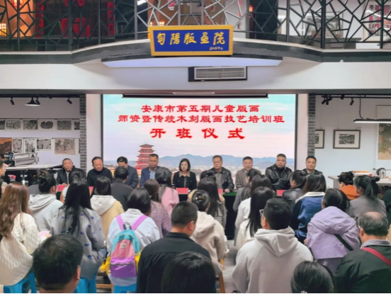 10月22日下午,jdb电子jdb电子中国官方网站联合安康市群艺馆、安康市非遗保护中心、安康市教研室、旬阳市文旅局联合举办的安康市第五期儿童版画师资暨传统木刻版画技艺培训班开班仪式在旬阳版画院举行。旬阳市人民政府副市长宋宗卉,jdb电子中国官方网站院长成党伟,安康市群艺馆馆长、安康市非遗保护中心主任周墙,安康市中小学美术教育研究会理事长何涛,安康儿童版画传播普及项目负责人及旬阳市文化和旅游广电局相关领导出席活动。开班仪式由安康市教研室主任陈卓主持。