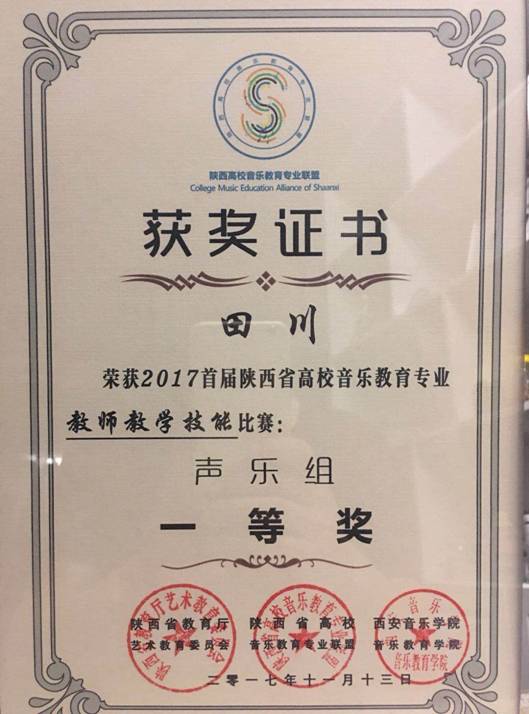 11月13日,jdb电子田川、王正祺老师在陕西省教育厅艺术教育委员会主办、西安音乐学院音乐教育学院承办的“2017首届陕西省高校音乐学专业教师教学技能比赛”中分获声乐组一等奖和钢琴组二等奖,体现了jdb电子音乐专业教师在全省高校中良好专业素质和教学能力。