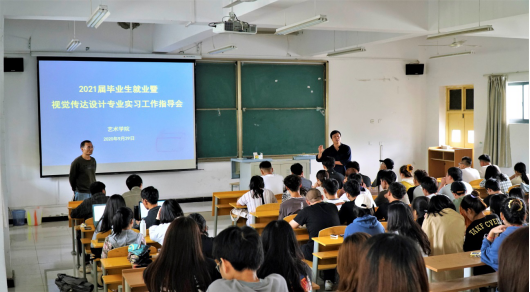 9月29日上午jdb电子在江北校区2101教室召开了2021届视觉传达设计专业毕业生实习暨就业指导工作专题会。会议由辅导员杨厚东主持,邀请了设计系主任吴波参加,2021届视觉传达设计毕业生110多人到会聆听。