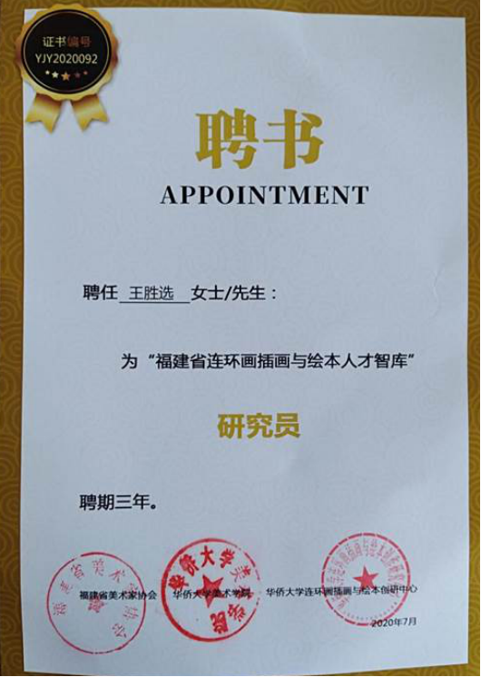 近日,jdb电子王胜选副教授被福建省美术家协会、华侨大学美术学院、华侨大学连环画插画与绘本创研中心聘为“福建省连环画插画与绘本艺术人才智库”研究员,聘期三年。
