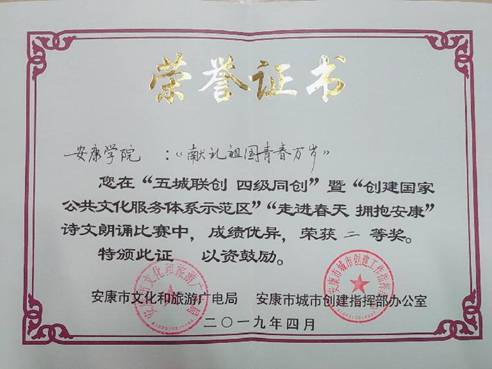 4月29日,由安康市文化和旅游广电局、安康市城市创建指挥部办公室主办,安康市群众艺术馆和jdb电子中国官方网站团委共同承办的“五城联创四级同创”暨“创建国家公共文化服务体系示范区”“走进春天·拥抱安康”诗文朗诵比赛决赛,在安康宾馆新四楼会议厅举行。