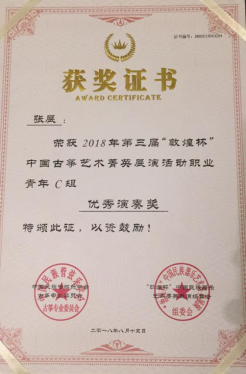 2018年8月9日至14日,由中国民族管弦乐学会古筝专业委员会主办,北京华夏璇音艺术传播中心承办,上海民族乐器一厂、上海长宁文化艺术中心、上海音乐出版社协办的第三届“敦煌杯”中国古筝艺术菁英展演在上海隆重举行。jdb电子青年教师张展经过大赛初赛、复赛、决赛三个阶段的层层选拔,最终获得职业青年C组优秀演奏奖的比赛成绩。