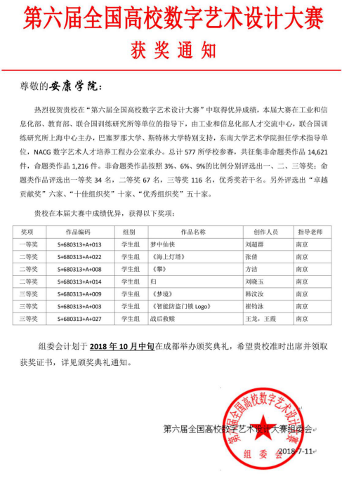 近日,2018年第六届全国高校数字艺术设计大赛比赛结果公布。jdb电子学子首次参加该项赛事,与包括北京大学、中国美术学院、东南大学、北京师范大学、华中师范大学、西北大学等众多985、211名校在内的全国共计577所高校学生同场角逐,jdb电子学子最终分别获得一等奖1项、二等奖3项、三等奖3项的喜人成绩。