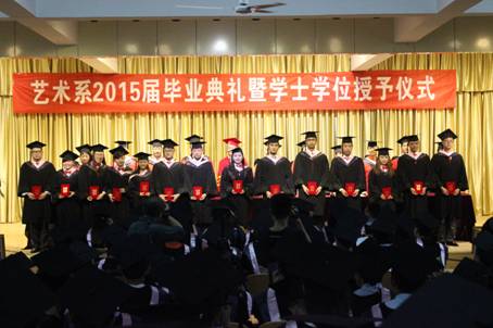 2015年6月30日上午9:00,我系在江北校区1401演艺厅举行2015届别典礼暨学士学位授予仪式。副校长向纪明教授、系主任单福东教授、系党总支书记冯丰收副教授、办学顾问党天才教授、系副主任雷升录副教授、系学工办主任刘泽桢副教授及艺术系副教授范义付、鲍丽、杨湘涛、杜敏、原春明以及教师代表、辅导员和我系2015届全体毕业生参加了毕业典礼。毕业典礼由系办公室主任肖剑主持。