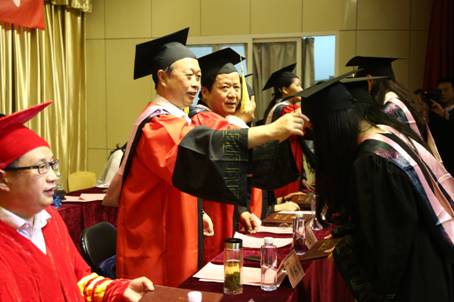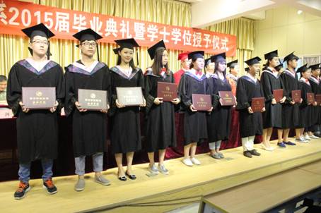 冯丰收书记宣读了学校关于对2015届优秀毕业生表彰决定和我系毕业展演获奖名单;雷升录副主任宣读了jdb电子中国官方网站关于对2015届本科毕业生授予学位的决定。接着各位导师为获奖同学们颁发了荣誉证书;为获得学位证书的毕业生颁发学位证书并为各位文艺学学士扶正流苏。今年我系共有267名毕业生,其中本科毕业生237人(235人授予文艺学学士学位),专科30人。