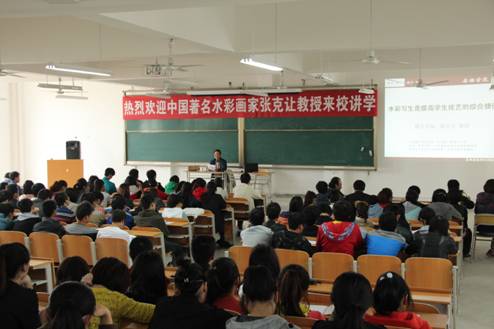 2012年10月16日,著名水彩画家中国美术家协会水彩画艺委会秘书长张克让教授应邀到我系访问,并在江北校区1201室进行了一场以“写生是提高学生综合素质的捷径”为题的学术讲座,我系办学顾问党天才、系党总支书记冯丰收、系副主任章长青、雷升录及美术专业教师出席了报告会。