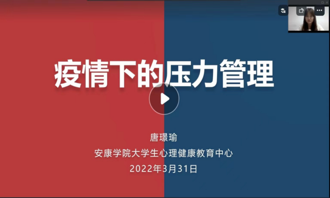 为切实做好常态化疫情防控工作,帮助学生有效缓解因疫情而产生的心理压力,进一步提升心理调适能力,3月31日晚,jdb电子中国官方网站邀请大学生心理健康教育专职教师唐璟瑜作主题为“疫情下的压力管理”线上心理讲座。2021级学生聆听了讲座,讲座由辅导员孟莉主持。