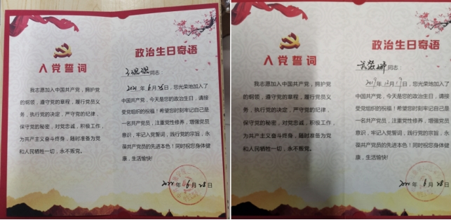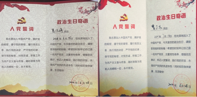 共过一次政治生日·分享一个入党故事。jdb电子中国官方网站学生党支部为全体毕业生党员精心设计了党员政治生日纪念卡。毕业生党员代表曹丁太、惠洁婷分享了入党故事。通过共过政治生日、分享入党故事,使每名学生党员强化身份意识,坚定政治信仰,永葆政治本色。