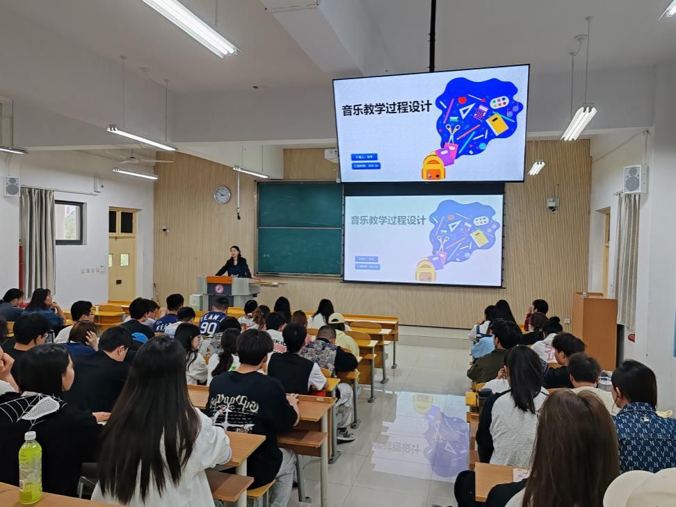 刘老师以《音乐教学过程设计》为题,深入浅出的为同学们讲解了初中音乐课两种课型的教学过程设计,并对导入、聆听感知、探究学唱、拓展升华和小结作业五个教学环节进行了细致入微的剖析。她结合自己的教学实践,通过生动的案例,向同学们展示了如何设计具有吸引力和实效性的音乐教学过程,使同学们对初中音乐教学设计有了更加清晰的认识和理解。