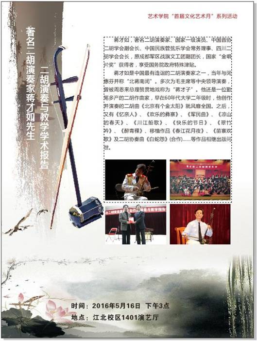 jdb电子中国官方网站“首届文化艺术月”——著名二胡演奏家蒋才如先生学术报告公告