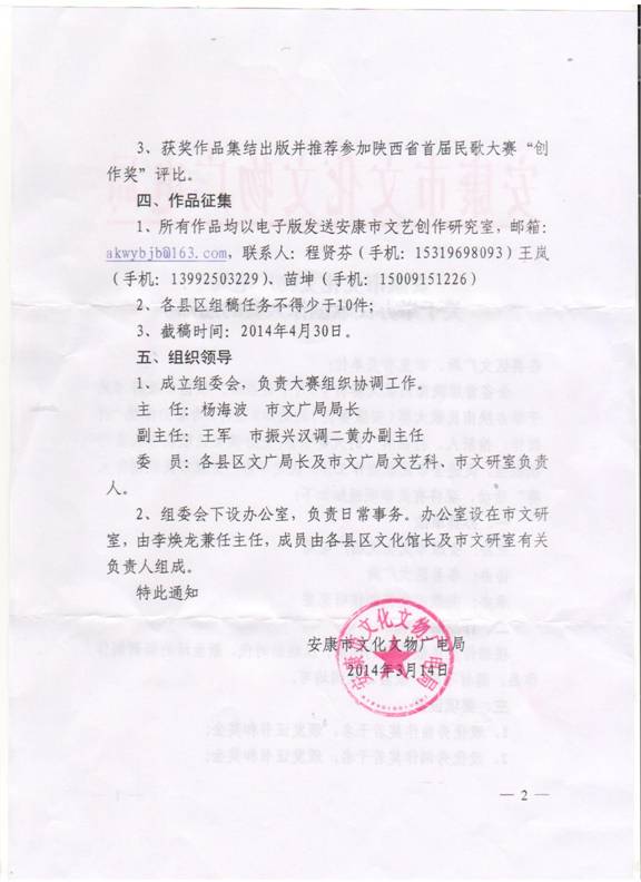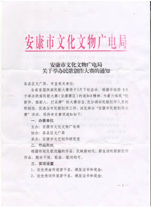 接市文广局通知,全省首届陕西民歌大赛将于3月下旬启动。根据市政府《关于举办陕南民歌大赛(安康赛区)的通知》精神,为着力体现:“创新作、推新人、打品牌”的大赛宗旨,充分调动民歌创作人员的积极性,促进全市民歌创作工作,决定举办“安康市民歌创作大赛”活动,有意参加的教师请按照通知中的参赛要求及方式,积极参赛!