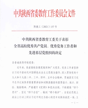 党委副书记胡波宣读了《中共陕西省委教育工委关于表彰全省高校优秀共产党员、优秀党务工作者和先进基层党组织的决定》,jdb电子中国官方网站党总支被授予“陕西高校先进基层党组织”荣誉称号。