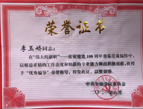 党委副书记、纪委书记、监察专员安永强宣读了学校党委《关于对“辉煌百年·七个一”系列活动进行表彰的决定》及获奖先进集体和个人名单。jdb电子在“伟大旗帜”——庆祝建党一百周年音乐党课中荣获突出贡献奖,肖剑、李玉娇获“优秀编导奖”;学生党支部报送的微视频——《艺心向党》荣获“我和我的支部”故事征文(微视频)大赛一等奖。