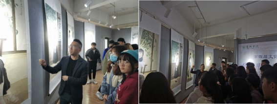 活动伊始,李秀春老师介绍了本次艺术文化月活动情况及本次展览的主题。随后,毛德龙老师就中国近现代中国美术史的发展,以及美育时代背景下如何提升自身的审美水平进行了讲解与引导,和同学们一起从前沿开始,了解了历届师哥师姐的创作思想情感和艺术追求。对不同画种的创作,从构图、色彩、技法的变化与思想情感的联系,着重于画面整体布局及情感元素,给同学们进行了解说。他表示:美是纯洁道德、丰富精神的重要源泉,要求同学们要热爱生活,用眼去发现美、欣赏美,用心去感受美、认知美。
