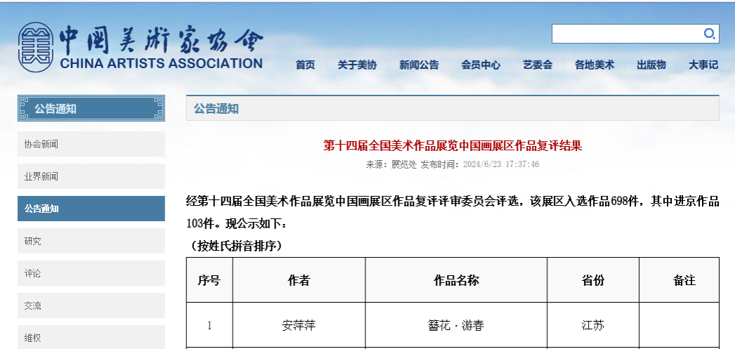 6月23日,中国美术家协会发布“第十四届全国美术作品展览中国画展区作品复评结果”,入选作品698件,jdb电子章长青老师1件作品《高速时代》入选。